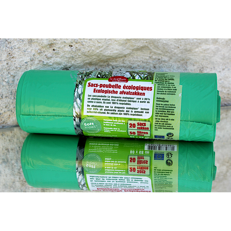 Rouleau de 20 sacs poubelle de 50 litres 100% recyclables, avec fermeture facile par lien positionné à la base du sac poubelle.